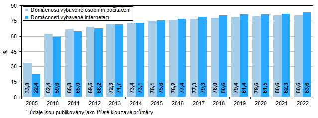 Podle výsledků šetření o využívání informačních a komunikačních technologií v domácnostech bylo 80,6 % domácností v Jihomoravském kraji v roce 2022 vybaveno osobním počítačem a 83,6 % domácností mělo přístup k internetu. Meziročně došlo jen k mírnému zvýšení procenta vybavenosti domácností internetem, a to o 1,3 procentního bodu. Posun v této oblasti je spíše patrný ze srovnání nynějších hodnot se situací např. v roce 2010, kdy počítač mělo 62,4 % domácností v kraji a přístup k internetu jen 59,6 % domácností.