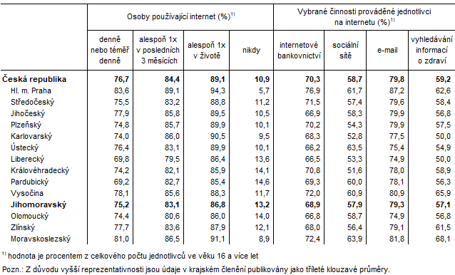 Internet v Jihomoravském kraji alespoň jednou v posledních 3 měsících použilo 83,1 % osob starších 16 let (doma, v zaměstnání, ve škole či jinde). V absolutním vyjádření se jedná o 809,4 tis. osob. Denně nebo téměř denně používalo internet v kraji 75,2 % osob starších 16 let (732,1 tis. osob), naopak 13,2 % osob tohoto věku (128,4 tis. osob) internet nepoužilo nikdy. Nejvyšší zastoupení každodenních uživatelů internetu evidovala Praha (83,6 % osob), na opačném konci srovnání se umístil Pardubický kraj s podílem 69,2 % osob. Podíl jednotlivců, kteří internet nepoužili nikdy, byl nejvyšší v Pardubickém kraji (14,6 %) a nejnižší v Praze (5,7 %).