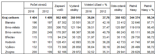 Základní údaje o volební účasti do Zastupitelstva Jihomoravského kraje 2016 podle okresů