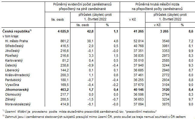 Objem mezd v Jihomoravském kraji vzrostl o 8,8 %. Subjekty v Jihomoravském kraji v 1. čtvrtletí 2023 zaměstnávaly 463,2 tis. osob (osoby přepočtené na plně zaměstnané). Mezi kraji to byl 2. nejvyšší počet (po hl. m. Praze) a byl o 1,7 tis. osob (tj. o 0,4 %) vyšší než ve stejném období předchozího roku.