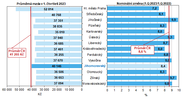 Průměrná hrubá měsíční nominální mzda (dále jen „průměrná mzda“) podle předběžných výsledků dosáhla v Jihomoravském kraji v 1. čtvrtletí 2023 částky 40 146 Kč (osoby přepočtené na plně zaměstnané) a proti stejnému období roku 2022 vzrostla o 3 120 Kč, tj. o 8,4 %. V mezikrajském srovnání byla mzda 3. nejvyšší (po hl. m. Praze a Středočeském kraji), ve srovnání s průměrem republiky byla o 1 119 Kč nižší. Nominální růst průměrné mzdy byl mezi kraji 7. nejvyšší, za republikovým průměrem zaostával o 0,2 procentního bodu. Nominální růst mezd byl zaznamenán ve všech krajích ČR.