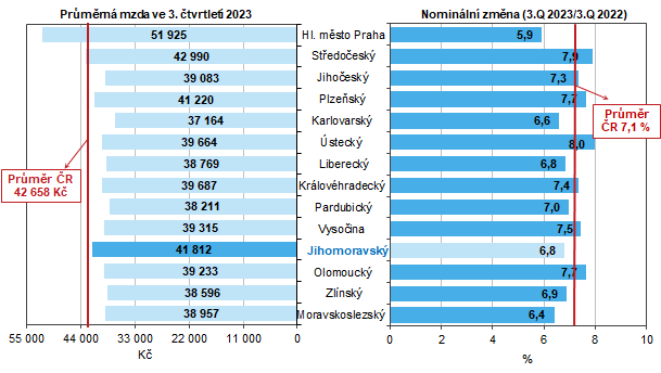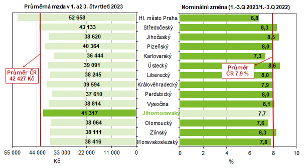Průměrná nominální mzda dosáhla v Jihomoravském kraji v 1. až 3. čtvrtletí roku 2023 výše 41 317 Kč a proti stejnému období minulého roku vzrostla o 2 951 Kč (o 7,7 %). Ve srovnání s ostatními kraji byla mzda 3. nejvyšší, avšak za republikovým průměrem zaostávala o 1 110 Kč. Nominální růst mzdy v kraji byl proti republikovému průměru o 0,2 procentního bodu nižší a v mezikrajském porovnání byl 4. nejnižší.