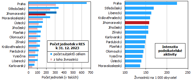 V Jihomoravském kraji bylo ke konci roku 2023 evidováno 316 tisíc subjektů zapsaných v Registru ekonomických subjektů (RES), přes 60 % z nich byli živnostníci.