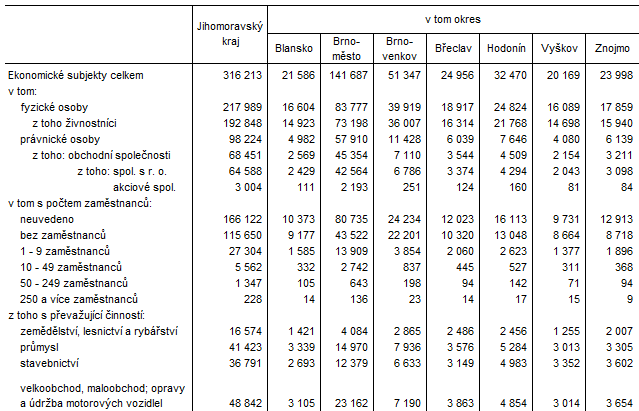 Z celkového počtu ekonomických subjektů jich v rámci Jihomoravského kraje nejvíce sídlilo v Brně‑městě (44,8 %) a v okrese Brno‑venkov (16,2 %), naopak nejméně subjektů bylo registrováno na Vyškovsku (6,4 %).