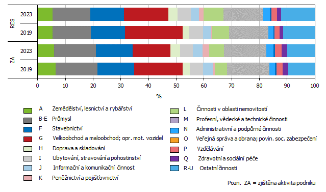 Je však nutno upozornit, že v registru ekonomických subjektů jsou uvedeny všechny jednotky bez ohledu na jejich ekonomickou aktivitu. Užší soubor, i když spíše z hlediska statistického využití, tvoří údaje za subjekty se zjištěnou aktivitou (dříve označované jako statistická jednotka typu podnik). Za tuto jednotku je považován subjekt, který podle informací ze statistických zjišťování nebo z administrativních zdrojů vykazuje ekonomickou činnost. Ke konci roku 2023 byla aktivita v Jihomoravském kraji zjištěna u 60,6 % z celkového počtu subjektů v RES. Jejich skladbu podle oboru činnosti znázorňuje graf 2. Je zřejmé, že struktura činností se v průběhu 5 srovnatelných let významně nezměnila s výjimkou odvětví velkoobchod a maloobchod, opravy a údržba motorových vozidel.