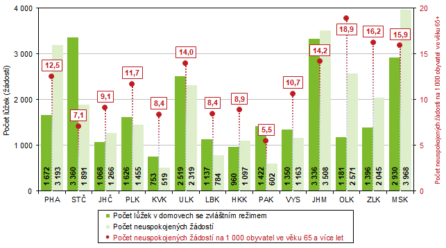 Kapacita v domovech se zvláštním režimem byla v Jihomoravském kraji 2. nejvyšší, hned po Středočeském kraji. Na stejném místě se však kraj umístil i v počtu neuspokojených žádostí za Moravskoslezským krajem. Počet neuspokojených žádostí (3 508) převyšuje počet lůžek, která jsou v těchto zařízeních k dispozici (3 336). Na 1 000 obyvatel Jihomoravského kraje ve věku 65 a více let připadá 14,2 neuspokojených žádostí. V relativním vyjádření to byl 4. nejvyšší počet, nejvíce neuspokojených žádostí na 1 000 obyvatel ve věku 65 a více let bylo v Olomouckém kraji (18,9).
