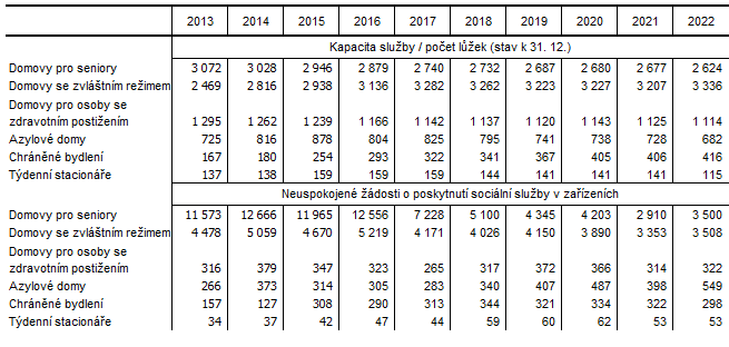 Od roku 2013 se kapacita vybraných pobytových zařízení uvedených v tabulce 2 snížila o 422 míst. Kontinuální nárůst počtu lůžek od roku 2013 vykazovala pouze chráněná bydlení, počet lůžek se zde za poslední desetiletí zvýšil téměř dvaapůlkrát. O více než třetinu vzrostla za toto období kapacita domovů se zvláštním režimem. Ve všech uvedených zařízeních (kromě chráněného bydlení) došlo v roce 2022 k meziročnímu nárůstu počtu neuspokojených žádostí o poskytnutí služeb. V domovech pro seniory to bylo o pětinu více, v domovech se zvláštním režimem činil nárůst 4,6 %. Neuspokojených žádostí o pobyt v týdenních stacionářích zůstal na úrovni roku 2021.