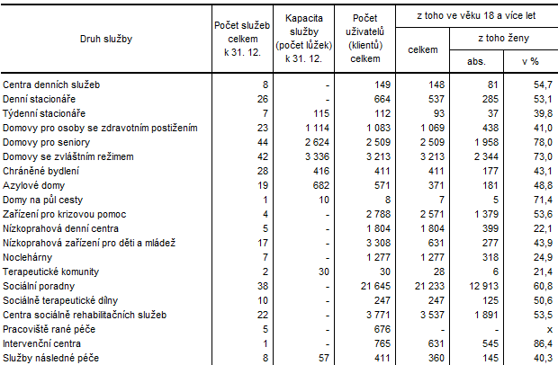 Z ambulantních služeb vykázaly nejvyšší počet klientů (21,6 tis.) sociální poradny, tohoto zařízení využilo 412 osob ve věku do 18 let. Mezi další hojně navštěvovaná zařízení patřila centra sociálně rehabilitačních služeb (3,8 tis. klientů), nízkoprahová zařízení pro děti a mládež (3,3 tis. uživatelů). Zařízení pro krizovou pomoc nabízející služby osobám, které se nachází v situaci ohrožení zdraví nebo života a přechodně nemohou řešit svou situaci vlastními silami, využilo 2,8 tis. osob. Mezi zařízení poskytující ambulantní služby patří také 26 denních stacionářů, 10 sociálně terapeutických dílen, 8 center denních služeb, 7 nocleháren, 5 pracovišť rané péče, 5 nízkoprahových denních center a 1 intervenční centrum.