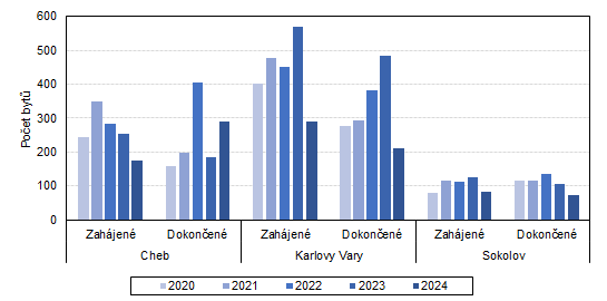 V Karlovarském kraji bylo v roce 2024 dokončeno celkem 575 bytů, což představuje ve srovnání předchozím rokem pokles o 196 bytů, tj. o 25,4 %. Jedná se o čtvrtý nejvyšší pokles v rámci celé ČR po Jihomoravském, Jihočeském a Moravskoslezském kraji. Tři čtvrtiny všech dokončených bytů v Karlovarském kraji se nachází v nové výstavbě.