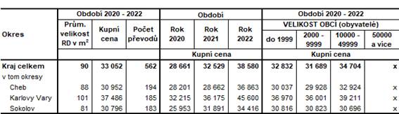 Průměrná kupní cena rodinného domu v Karlovarském kraji dosahovala ve tříletém období 2020 až 2022 výše 33 052 Kč/m2. V mezikrajském srovnání jde čtvrtou nejnižší hodnotu, jež se pohybuje 9 711 Kč/m2 pod průměrem ČR (42 763 Kč/m2). Nižší průměrnou kupní cenu za 1 m2 zaznamenal již pouze kraj Zlínský (32 356 Kč/m2), Olomoucký (32 572 Kč/m2) a Ústecký (32 690 Kč/m2).