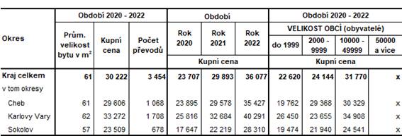 V Karlovarském kraji dosáhla v letech 2020 až 2022 průměrná kupní cena bytu nejvyšší úrovně tradičně v okrese Karlovy Vary, ve kterém se kupoval 1 m2 bytové jednotky průměrně za 33 272 Kč. Naopak nejnižší úrovně dosáhla průměrná kupní cena bytů v okrese Sokolov, ve kterém bylo možné pořídit 1 m2 bytového prostoru v průměru za 23 509 Kč.