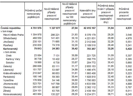 Průměrná doba trvání 1 případu dočasné pracovní neschopnosti v Karlovarském kraji činila 32,26 kalendářního dne, což je o 0,31 dne více než v celé ČR. Jedná se o šestou nejvyšší hodnotu tohoto ukazatele (společně s Jihočeským krajem) mezi všemi regiony ČR. V rámci našeho kraje nejdéle marodili lidé v okrese Karlovy Vary, kde průměrná doba trvání 1 případu dočasné pracovní neschopnosti činila 34,23 kalendářního dne.