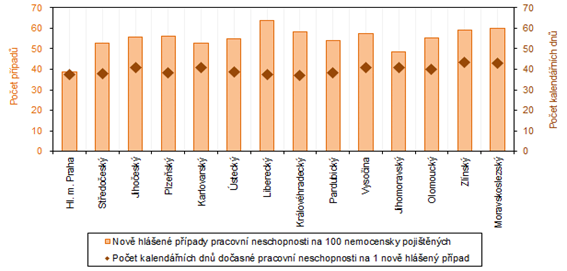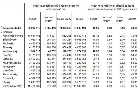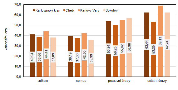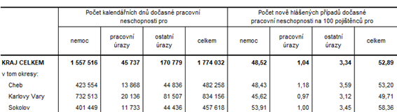 ve srovnání s minulým rokem se tato doba zvýšila o 0,6 dne. Jedná se o 4. nejvyšší hodnotu tohoto ukazatele mezi všemi regiony ČR po Zlínském, Moravskoslezském a Jihomoravském kraji. Zároveň je o 1,5 dne vyšší než kolik činí republikový průměr (39,4 dne). V rámci našeho kraje nejdéle marodili lidé v okrese Karlovy Vary, kde průměrná doba trvání 1 případu dočasné pracovní neschopnosti činila 44,4 kalendářního dne, naopak nejméně v okrese Sokolov