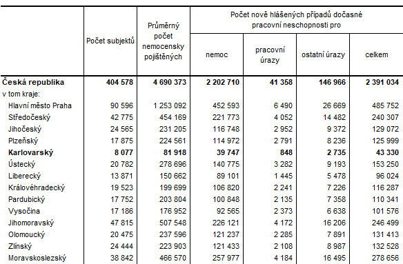 Průměrná doba trvání 1 případu dočasné pracovní neschopnosti v Karlovarském kraji činila 40,9 kalendářního dne,