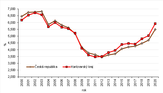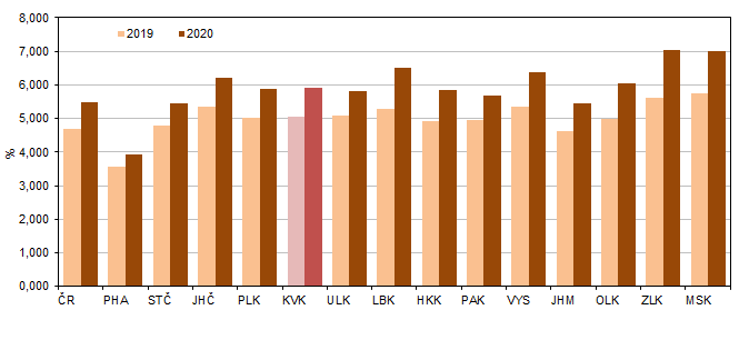 Průměrné procento dočasné pracovní neschopnosti se v Karlovarském kraji meziročně zvýšilo z 5,037 % v roce 2019 na 5,917 % v roce 2020, což představuje 7. nejvyšší hodnotu tohoto ukazatele mezi všemi regiony ČR a zároveň převyšuje celorepublikový průměr o 0,427 procentního bodu. Nejvyšší hodnotu průměrného procenta dočasné pracovní neschopnosti vykazovaly Zlínský (7,042 %) a Moravskoslezský (6,996 %) kraj. Naopak nejnižší hodnotu si udržovalo Hlavní město Praha (3,942 %). V celé ČR platí, že průměrné procento pracovní neschopnosti žen převyšuje celkové průměrné procento pracovní neschopnosti. V našem kraji dosáhlo průměrné procento pracovní neschopnosti žen v roce 2020 hodnoty 6,604 %.