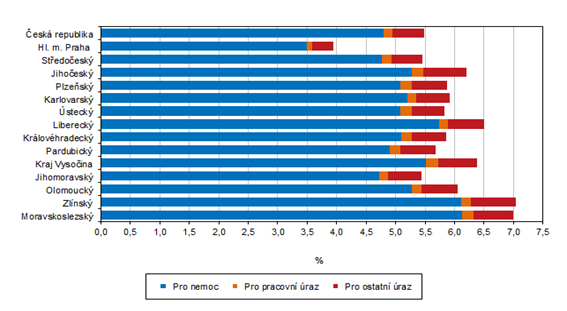 Dočasná pracovní neschopnost pro nemoc a úraz podle krajů v roce 2020