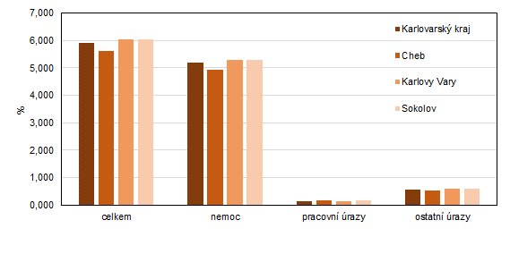 Mezi okresy Karlovarského kraje vykazoval největší průměrné procento dočasné pracovní neschopnosti okres Sokolov (6,042 %), naopak nejnižší okres Cheb (5,620 %).