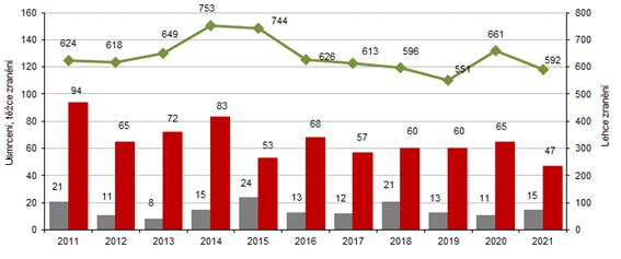 Počet usmrcených, těžce a lehce zraněných osob v Karlovarském kraji v letech 2011 až 2021