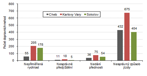 Hlavní příčinou více než poloviny dopravních nehod v Karlovarském kraji byl nesprávný způsob jízdy (61,3 % z celkového počtu nehod zaviněných řidiči motorových vozidel). Mezi další příčiny vzniku nehod patřila nepřiměřená rychlost (17,8 %) a nedání přednosti v jízdě (6,7 %). Z pohledu zavinění dopravních nehod je zřejmě, že byly primárně způsobeny řidičem motorového vozidla (87,1 %) a dále střetem s lesní zvěří či domácími zvířaty (8,0 %). Téměř dvě třetiny nehod se udály v obci (64,0 %), přičemž nejvíce jich bylo zaznamenáno na silnicích III. třídy (15,2 %). Naopak nejméně jich Policie ČR zaznamenala na dálnici D6 (4,7 %).