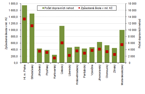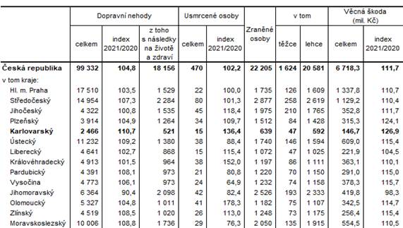 Hmotná škoda, vzniklá v roce 2021 při dopravních nehodách, činila v našem kraji 146,7 mil. Kč, meziročně tak její hodnota vzrostla o 26,9 %. Ve srovnání s ostatními regiony ČR se jednalo o nejvyšší meziroční nárůst. Na 1 dopravní nehodu v Karlovarském kraji připadla v průměru škoda ve výši 59,5 tis. Kč a v mezikrajském srovnání tak vykázal náš region pátou nejnižší hodnotu. Nejvyšší průměrná hmotná škoda, vyčíslená na 1 dopravní nehodu, byla evidována v Jihočeském kraji (81,6 tis. Kč), nejnižší hodnotu zaznamenal naopak kraj Liberecký (47,8 tis. Kč).