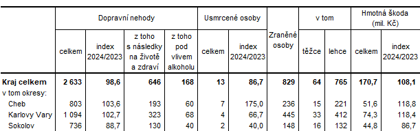 Na silnicích Karlovarského kraje došlo v roce 2024 celkem ke 2 633 dopravním nehodám, což představuje mírný meziroční pokles (o 1,4 %). Hmotná škoda, zaznamenaná v souvislosti s dopravními nehodami, dosáhla výše 170,7 mil. Kč a ve srovnání s uplynulým rokem se tak její hodnota zvýšila o 8,1 %. Zraněním neslučitelným se životem podlehlo 13 osob, těžká zranění utrpělo 64 osob a 765 účastníků dopravních nehod bylo zraněno lehce.