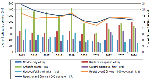 Ukazatel počtu registrovaných trestných činů na 1 000 obyvatel dosáhl v roce 2024 v Karlovarském kraji hodnoty 16,9. V mezikrajském srovnání se jedná o čtvrtou nejvyšší hodnotu po Hl. městě Praze, Ústeckém a Moravskoslezském kraji. Nejméně trestných činů na 1 000 obyvatel bylo ve sledovaném roce spácháno v Pardubickém kraji a v Kraji Vysočina (9,9, resp. 10,0). Průměrná hodnota tohoto ukazatele v celé ČR činila téměř 16 trestných činů (15,9).