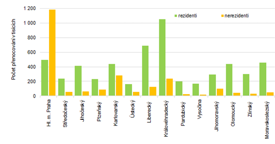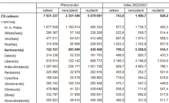 V 1. čtvrtletí roku 2022 se celkový počet ubytovaných hostů v hromadných ubytovacích zařízeních Karlovarského kraje meziročně zvýšil 13krát a počet přenocování vzrostl 7krát. Tyto prudké nárůsty byly značně ovlivněny výrazným propadem cestovního ruchu v předcházejících dvou letech z důvodu opatření souvisejících s pandemií onemocnění COVID-19. V hodnocení krajů podle počtu hostů byl Karlovarský kraj v 1. čtvrtletí roku 2022 pátým nejnavštěvovanějším regionem ČR, podíl na republikovém úhrnu dosáhl 6,9 %. Na celkovém počtu přenocování v našem kraji participovali nerezidenti pouze 39,3 %.