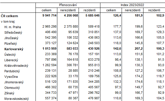 V Karlovarském kraji strávili hosté v hromadných ubytovacích zařízeních v 1. čtvrtletí roku 2023 celkem 1 013 959 nocí, ve srovnání se shodným obdobím roku 2022 je to o 302 919, tj. o 42,6 % více. Na tomto meziročním nárůstu celkového počtu přenocování se podíleli hosté ze zahraničí. U zahraniční klientely došlo více než k dvojnásobnému navýšení (o 107,2 %), zatímco počet přenocování hostů z tuzemska se prakticky nezměnil.