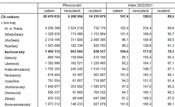 V celé ČR dosáhl počet přenocování hostů v hromadných ubytovacích zařízeních ve 3. čtvrtletí roku 2022 celkem 20,4 milionu nocí, což bylo o 7,4 % více než ve stejném období předchozího roku. Počet přenocování nerezidentů se zvýšil téměř dvojnásobně, ale počet nocí strávených domácími hosty meziročně poklesl o 10,5 %.