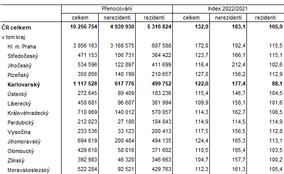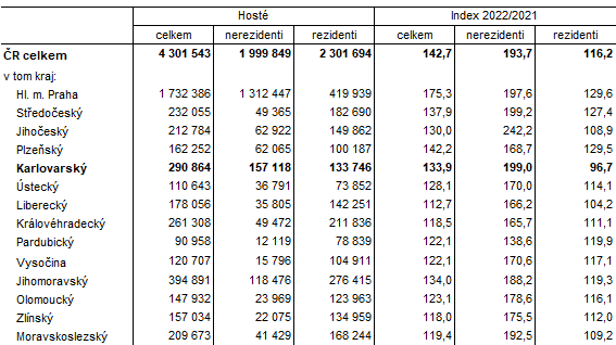 V průběhu celého roku 2022 se v Karlovarském kraji ubytovalo celkem 1 157 885 hostů, což je o 63 % více než v roce předcházejícím. Počet domácích hostů se navýšil o více než pětinu (o 21,6 %). Nerezidentů přijelo o 175,8 % více. Počet přenocování v hromadných ubytovacích zařízeních činil v Karlovarském kraji v roce 2022 celkem 4 354 062 nocí, ve srovnání s rokem 2021 došlo k nárůstu o 53,7 %. Počet přenocování domácích hostů se přitom zvýšil o 12,3 %, hosté ze zahraničí trávili v hromadných ubytovacích zařízeních v našem kraji dokonce o 165,7 % více nocí než ve stejném období minulého roku.