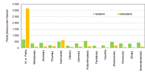 Počet přenocování podle krajů v ČR ve 4. čtvrtletí 2022