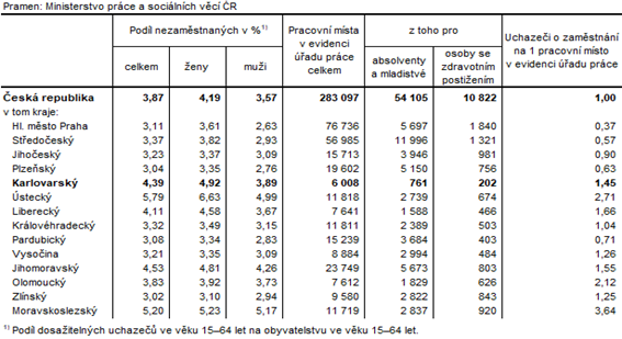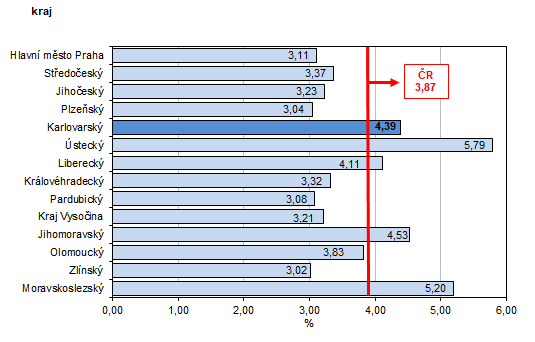 Podíl nezaměstnaných v Karlovarském kraji dosáhl na konci sledovaného měsíce hodnoty 4,39 %. Po Ústeckém (5,79 %), Moravskoslezském (5,20 %) a Jihomoravském (4,53 %) kraji se tak jedná o čtvrtý nejvyšší podíl mezi všemi regiony ČR a celorepublikový průměr převyšuje o 0,52 procentního bodu. Naopak nejnižší podíl nezaměstnaných byl zaznamenán ve Zlínském (3,02 %) a v Plzeňském kraji (o 3,04 %).
