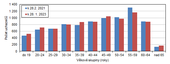 Mezi uchazeči o zaměstnání převládali na konci února roku 2023 lidé ve věku 55 až 59 let (1 164 osob), kteří se na celkovém počtu uchazečů podíleli 13,4 %. Průměrný věk uchazečů o zaměstnání dosáhl ve sledovaném období v Karlovarském kraji 43 let a nezaměstnaní tak byli o 0,6 roku mladší než před rokem. Ke stejnému datu bylo evidováno na úřadech našeho kraje 3 046 uchazečů o zaměstnání, kteří byli v evidenci maximálně tři měsíce, to představuje 35 % všech uchazečů o zaměstnání. Meziročně došlo k nárůstu těchto krátkodobě nezaměstnaných o 8,2 % (z 2 815 k 28. 2. 2022 na 3 046 k 28. 2. 2023).