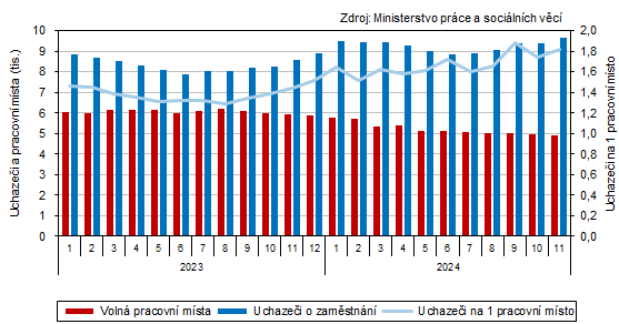 Pracovní místa v evidenci úřadu práce a počet uchazečů o zaměstnání na 1 pracovní místo v krajích ČR k 30. 11. 2024