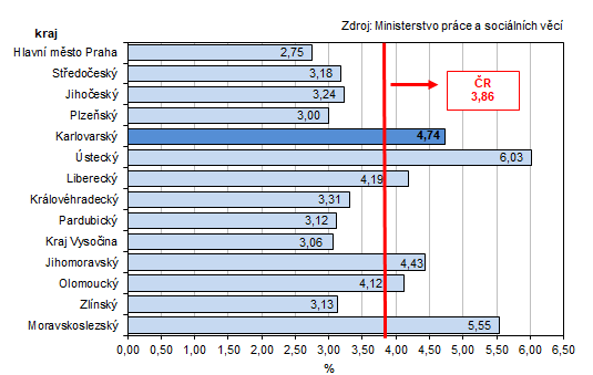 Podíl nezaměstnaných v Karlovarském kraji dosáhl na konci sledovaného měsíce hodnoty 4,74 %. Po Ústeckém (6,03 %) a Moravskoslezském (5,55 %) kraji se tak jedná o třetí nejvyšší podíl mezi všemi regiony ČR a celorepublikový průměr převyšuje o 0,87 procentního bodu. Naopak nejnižší podíl nezaměstnaných byl zaznamenán v Hlavním městě Praze (2,75 %) a v Plzeňském kraji (3,00 %).