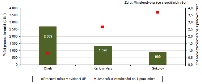 Z okresů Karlovarského kraje je na tom stále nejlépe okres Cheb, kde na 1 volné pracovní místo připadá 0,79 uchazeče o zaměstnání. Naopak nejhorší bilanci můžeme tradičně pozorovat v okrese Sokolov, na konci sledovaného měsíce zde připadali na 1 volné pracovní místo dokonce 3,68 uchazeče.