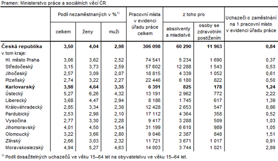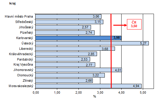 Podíl nezaměstnaných v Karlovarském dosáhl na konci sledovaného měsíce hodnoty 3,98 %. Po Ústeckém (5,27 %), Moravskoslezském (4,94 %) a Jihomoravském kraji (4,01 %) se tak jedná o čtvrtý nejvyšší podíl mezi všemi regiony ČR a celorepublikový průměr převyšuje o 0,48 procentního bodu. Naopak nejnižší podíl nezaměstnaných byl zaznamenán v Pardubickém (2,53 %) a Jihočeském kraji (2,57 %).