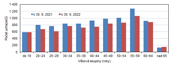 Mezi uchazeči o zaměstnání převládali na konci září 2022 lidé ve věku 55 až 59 let (1 060 osob), kteří se na celkovém počtu uchazečů podíleli 13,4 %. Průměrný věk uchazečů o zaměstnání dosáhl ve sledovaném období v Karlovarském kraji 42,7 roku a nezaměstnaní tak byli stejně staří jako před rokem.