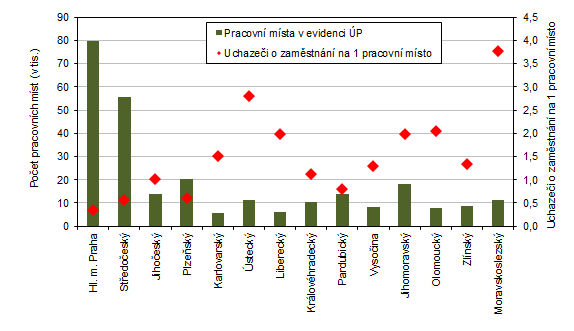 Na 1 volné pracovní místo připadal největší počet uchazečů v Moravskoslezském a Ústeckém kraji (3,78, resp. 2,81). V našem kraji činila hodnota tohoto ukazatele 1,52, což je šestý nejvyšší údaj v rámci celé ČR a zároveň je to o 0,49 uchazeče více, než kolik činil celorepublikový průměr. Naopak nejméně uchazečů na 1 volné pracovní místo bylo v Hlavním městě Praze (0,34) a Středočeském kraji (0,57).