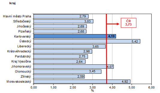 Naopak nejnižší hodnotu tohoto ukazatele zaznamenal v našem kraji okres Cheb (3,43 %), který se umístil na 36. místě pomyslného celorepublikového žebříčku.