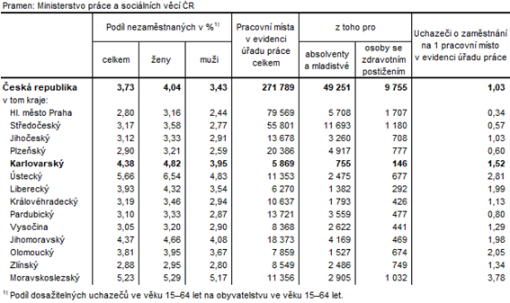 Podíl nezaměstnaných v Karlovarském kraji dosáhl na konci sledovaného měsíce hodnoty 4,38 %. Po Ústeckém (5,66 %) a Moravskoslezském (5,23 %) kraji se tak jedná o třetí nejvyšší podíl mezi všemi regiony ČR a celorepublikový průměr převyšuje o 0,65 procentního bodu. Naopak nejnižší podíl nezaměstnaných byl zaznamenán v Hlavním městě Praze (2,80 %) a ve Zlínském kraji (2,88 %).