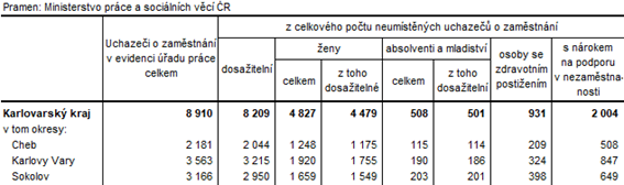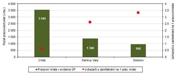 Z okresů Karlovarského kraje je na tom stále nejlépe okres Cheb, kde na 1 volné pracovní místo připadá 0,62 uchazeče o zaměstnání. Naopak nejhorší bilanci můžeme tradičně pozorovat v okrese Sokolov, na konci sledovaného měsíce zde připadali na 1 volné pracovní místo dokonce více než 3 uchazeči (3,31).