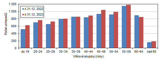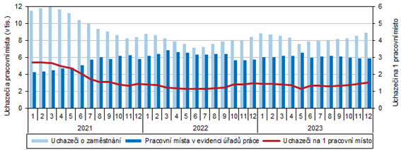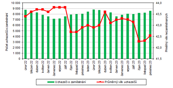 V Karlovarském kraji bylo k 31. 12. 2023 evidováno na úřadech práce celkem 8 910 uchazečů o zaměstnání, z toho 8 209, tj. 92,1 % dosažitelných. Počet uchazečů se tak meziměsíčně zvýšil o 345, tj. o 4,0 %. Více než polovinu z celkového počtu uchazečů tvořily ženy (54,2 %, tj. 4 827). Absolventů a mladistvých uchazečů o zaměstnání bylo evidováno na konci sledovaného měsíce celkem 508 (5,7 % všech uchazečů) a mezi uchazeči bylo také 931 osob se zdravotním postižením.