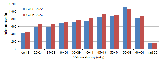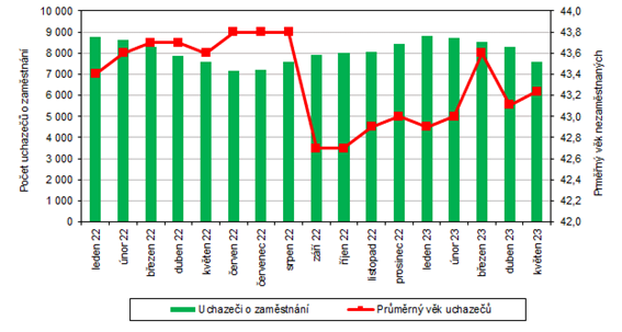 Mezi uchazeči o zaměstnání převládali na konci května 2023 lidé ve věku 55 až 59 let (1 080 osob), kteří se na celkovém počtu uchazečů podíleli 13,3 %. Druhou nejpočetnější skupinou byli uchazeči ve věku 45 až 49 let (932). Průměrný věk uchazečů o zaměstnání dosáhl ve sledovaném období v Karlovarském kraji 43,2 let a nezaměstnaní tak byli o 0,4 roku mladší než před rokem. Ke stejnému datu bylo evidováno na úřadech práce našeho kraje 2 449 uchazečů o zaměstnání, kteří byli v evidenci maximálně tři měsíce, to představuje 30,2 % všech uchazečů o zaměstnání. Meziročně došlo k nárůstu počtu těchto krátkodobě nezaměstnaných o 11,7 % (z 2 192 k 31. 5. 2022 na 2 449 k 31. 5. 2023) a zároveň jejich podíl na celkovém počtu nezaměstnaných doznal nárůst o 1,4 procentního bodu.