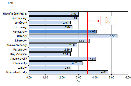 Naopak nejnižší hodnotu tohoto ukazatele zaznamenal v našem kraji okres Cheb (3,14 %), který se umístil na 45. místě pomyslného celorepublikového žebříčku.