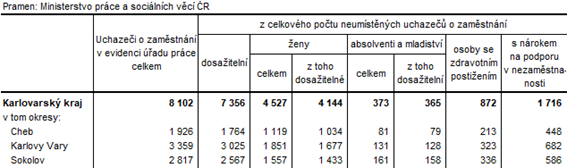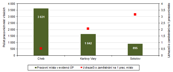 Z okresů Karlovarského kraje je na tom stále nejlépe okres Cheb, kde na 1 volné pracovní místo připadá 0,53 uchazeče o zaměstnání. Naopak nejhorší bilanci můžeme tradičně pozorovat v okrese Sokolov, na konci sledovaného měsíce zde připadalo na 1 volné pracovní místo dokonce 3,15 uchazeče.