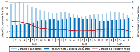 Pracovní místa v evidenci úřadu práce a počet uchazečů o zaměstnání na 1 pracovní místo v krajích ČR k 31. 5. 2023