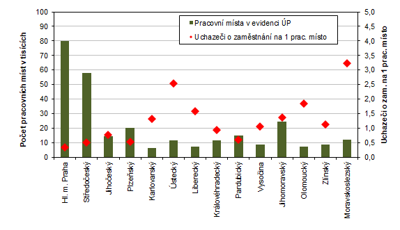 Na 1 volné pracovní místo připadal největší počet uchazečů v Moravskoslezském a Ústeckém kraji (3,24, resp. 2,54). V našem kraji činila hodnota tohoto ukazatele 1,31, což je šestý nejvyšší údaj v rámci celé ČR a zároveň je to o 0,42 uchazeče více, než kolik činil celorepublikový průměr. Naopak nejméně uchazečů na 1 volné pracovní místo bylo v Hlavním městě Praze (0,34) a Středočeském kraji (0,51).