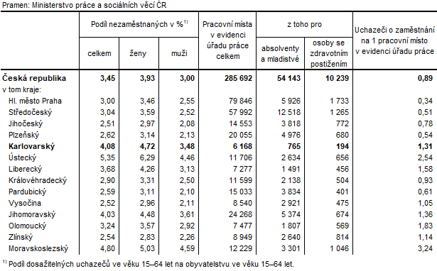 Podíl nezaměstnaných v Karlovarském kraji dosáhl na konci sledovaného měsíce hodnoty 4,08 %. Po Ústeckém (5,35 %) a Moravskoslezském ( (4,80 %) kraji se tak jedná o třetí nejvyšší podíl mezi všemi regiony ČR a celorepublikový průměr převyšuje o 0,63 procentního bodu. Naopak nejnižší podíl nezaměstnaných byl zaznamenán v Jihočeském kraji (2,51 %) a v Kraji Vysočina (2,52 %).