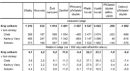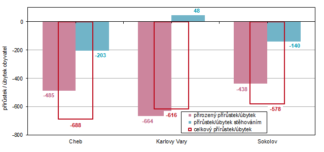Počet obyvatel se snížil ve všech okresech bez výjimky. Největší pokles počtu obyvatel v porovnání se stavem na počátku roku přitom vykázal okres Cheb, a to o 688 osob.